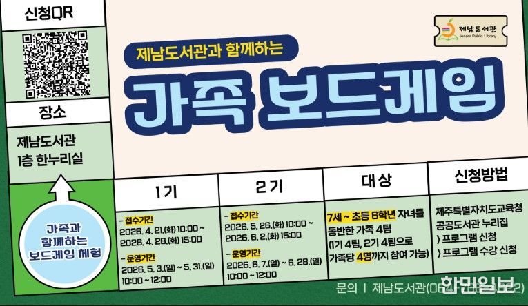 한민일보 서울포커스 임경복 기자 | 제주도교육청 제남도서관은 21일 가족이 함께하는 건전한 놀이 문화를 확산하고 도서관 이용을 활성화하기 위해 오는 5월과 6월에 걸쳐 운영되는 ‘가족 보드게임’의 참가자를 모집한다.