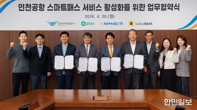 한민일보 서울포커스 유창렬 기자 | 인천국제공항공사는 인천공항의 안면인식 출국 서비스인 ‘스마트패스’의 등록 채널을 확대하기 위해 네이버페이, NH농협은행, 카카오뱅크와 ‘스마트패스 서비스 활성화 업무협약’을 체결했다고 21일 밝혔다.