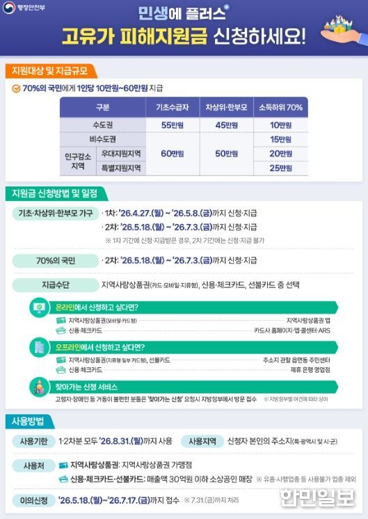 1차는 4월 27일부터 5월 8일까지로 기초생활수급자와 차상위·한부모 가구를 대상으로 우선 지급되며, 2차는 5월 18일부터 7월 3일까지로 1차 미신청자와 일반 대상자가 신청할 수 있다.