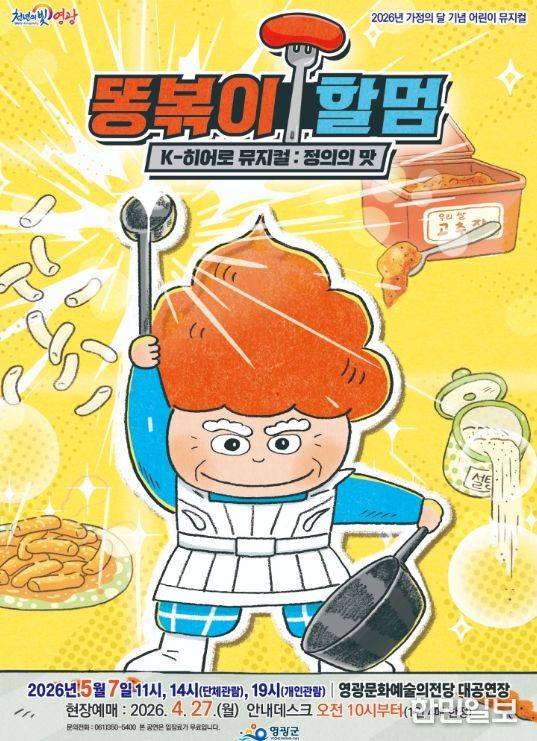 한민일보 서울포커스 박용남 기자 | 영광군은 오는 5월 7일 오전 11시(단체관람), 오후 2시(단체관람), 7시에 영광문화예술의전당 대공연장에서 가정의 달 특집공연 웃음과 감동, 그리고 건강한 메시지를 전하는 이야기 ‘어린이뮤지컬 똥볶이 할멈’을 공연한다.
