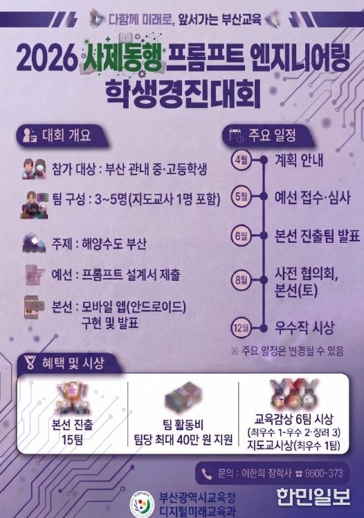 한민일보 서울포커스 임광현 기자 | 부산광역시교육청은 관내 중·고등학생과 교사가 한 팀으로 참여하는 ‘사제동행 2026 프롬프트 엔지니어링 학생경진대회’를 개최한다고 밝혔다.