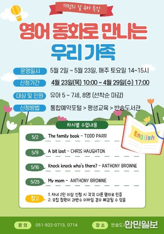 한민일보 서울포커스 임광현 기자 | 부산광역시립반송도서관은 다음달 2일부터 23일까지 매주 토요일마다 도서관 유아가족실에서 5~7세 유아 8명을 대상으로 가정의 달 유아 특강 ‘영어 동화로 만나는 우리 가족’을 운영한다.