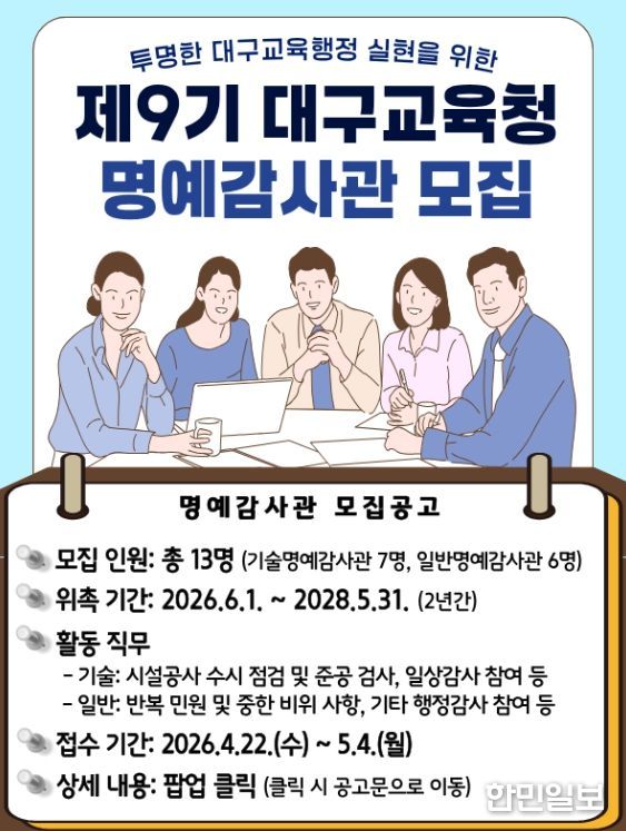 한민일보 서울포커스 임경복 기자 | 대구시교육청은 시민 참여를 통해 감사의 공정성과 투명성을 높이기 위해 ‘제9기 명예감사관’ 13명을 공개 모집한다고 밝혔다.