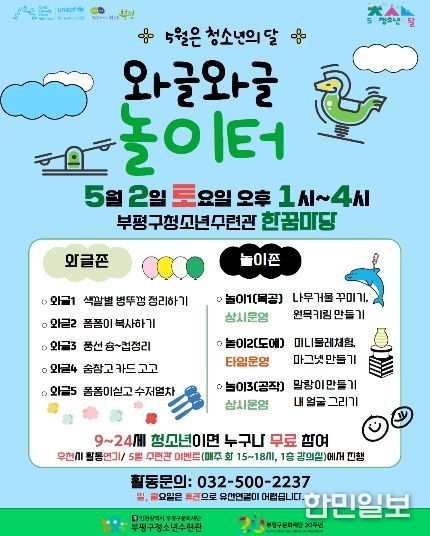 한민일보 서울포커스 김성혜 기자 | 부평구청소년수련관은 오는 5월 2일 청소년 체험 행사 ‘와글와글 놀이터’를 운영한다고 밝혔다.