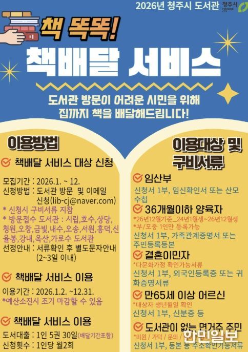 한민일보 서울포커스 김다남 기자 | 청주시는 도서관 방문이 어려운 독서 취약계층을 위해 운영 중인 ‘책 똑똑! 책배달 서비스’ 신청자가 600명을 돌파했다고 23일 밝혔다.