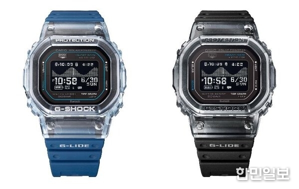 1983년 첫 출시 이후 G-SHOCK 시계는 뛰어난 충격 저항성을 유지하면서 기능, 구조, 디자인 측면에서 지속적으로 진화해 왔다. 익스트림 스포츠를 위해 설계된 G-LIDE 라인은 높은 인기를 얻고 있다. 이 라인은 조수 높이를 보여주는 조수 그래프와 달의 위상을 나타내는 문 데이터 등 서핑을 포함한 해변 활동과 수상 스포츠에 유용한 기능을 제공한다.