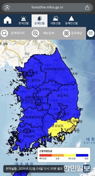 한민일보 서울포커스 기자 | 산림청 국립산림과학원은 2월부터 사용자가 자신의 현재 위치를 기반으로 산불위험 정보를 실시간으로 확인할 수 있는 '국가산불위험예보시스템'을 모바일 반응형으로 전환하여 제공하고 있다고 밝혔다.