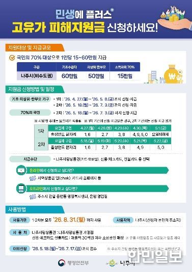 한민일보 서울포커스 임광현 기자 | 전남 나주시가 중동전쟁으로 인한 고유가·고환율·고물가로 어려움을 겪고 있는 시민들의 생활 안정을 위해 고유가 피해지원금 1차 지급을 4월 27일부터 시작하며 최대 60만 원을 지원하고 찾아가는 신청 서비스를 운영한다.
