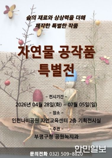 한민일보 서울포커스 김성혜 기자 | 부평구는 부평숲 인천나비공원에서 오는 28일부터 ‘자연물 공작품 특별전’을 개최한다고 밝혔다.