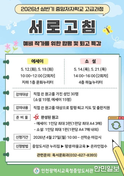 한민일보 서울포커스 유창렬 기자 | 인천광역시교육청중앙도서관은 4월 27일부터 예비 작가를 위한 ‘중앙저자학교 고급과정’ 참여자를 모집한다.