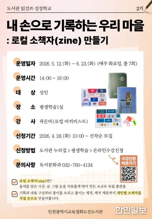 한민일보 서울포커스 유창렬 기자 | 인천광역시교육청화도진도서관은 오는 28일부터 지역의 일상을 기록으로 담아내고 공유하는 시민 참여형 프로그램 ‘내 손으로 기록하는 우리 마을’의 참여자를 모집한다.