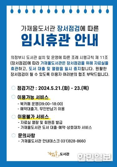 한민일보 서울포커스 김순철 기자 | 의정부시는 5월 21일부터 23일까지 3일간 장서점검을 위해 가재울도서관을 임시휴관한다고 밝혔다.