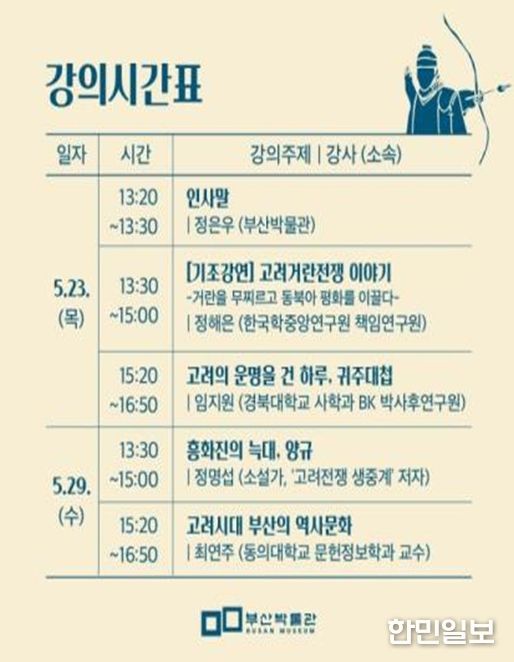 한민일보 서울포커스 김순철 기자 | 부산시립박물관은 오는 5월 23일과 5월 29일 양일간 오후 1시 30분부터 박물관 대강당에서 제40기 역사문화강좌 '고려거란전쟁'을 개최한다고 밝혔다.