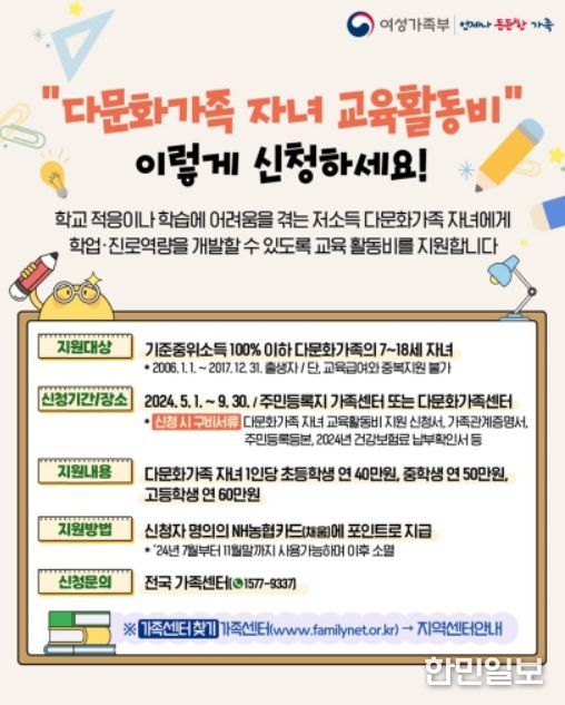 한민일보 서울포커스 김순철 기자 | 의정부시는 5월 1일부터 9월 30일까지 의정부시 가족센터에서 ‘다문화가족 자녀 교육활동비 지원사업’ 신청을 접수한다.