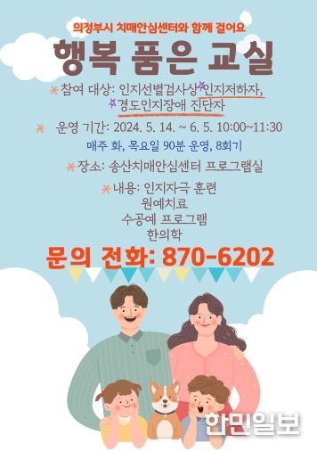 한민일보 서울포커스 김순철 기자 | 의정부시 보건소 송산치매안심센터는 치매 고위험군 노인의 발병 위험성을 낮추는 인지강화 프로그램 ‘행복품은 교실’을 운영한다.