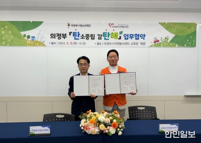 한민일보 서울포커스 김순철 기자 | 의정부시자원봉사센터는 5월 9일 의정부시자원봉사센터에교육장‘채움’에서 의정부시청소년재단과 함께 탄소 중립 실천에 협업하여 다양한 기후위기 대응 활동을 실천하고자‘의정부'탄소중립 감탄해'업무협약’을 실시했다.