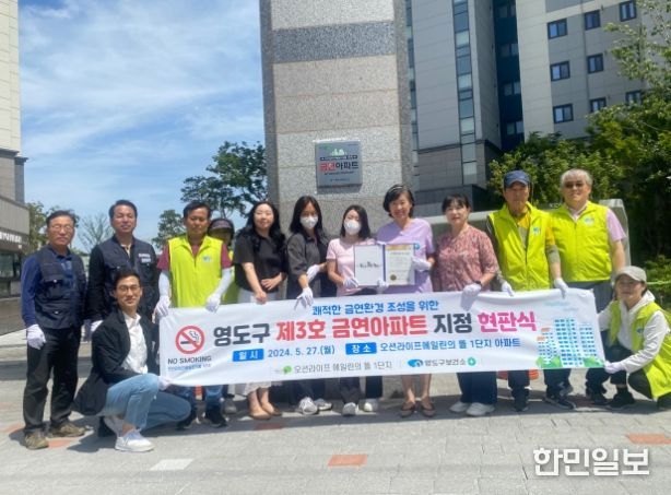 한민일보 서울포커스 김순철 기자 | 영도구 보건소는 담배 연기 없는 건강하고 쾌적한 아파트 문화 조성을 위해 오션라이프 에일린의 뜰 1단지 아파트를 영도구 제3호 공동주택 금연구역으로 지정하고 지난 5월 27일 현판식을 개최했다.