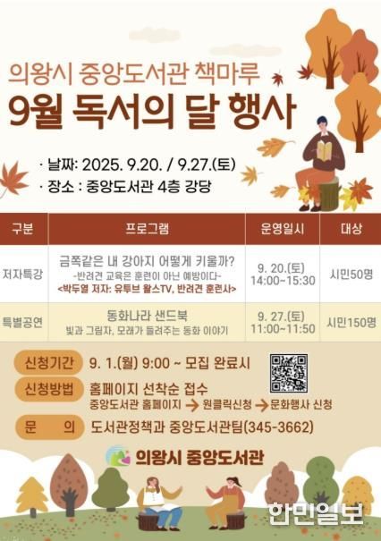 행사 참여 신청은 오는 9월 1일부터 중앙도서관 홈페이지를 통해 선착순으로 진행되며, 프로그램에 관한 기타 자세한 사항은 홈페이지 공지사항란을 확인하거나 의왕시 중앙도서관으로 문의하면 안내받을 수 있다.