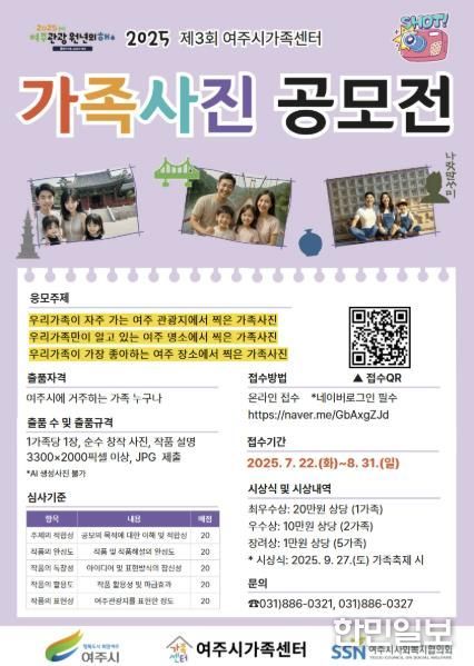 한민일보 서울포커스 전희주 기자 | 여주시가족센터에서는 2025년 여주 관광원년의 해를 기념하여 제3회 가족사진 공모전 '여주를 담은 우리 가족'을 오는 8월 31일까지 접수한다고 밝혔다.