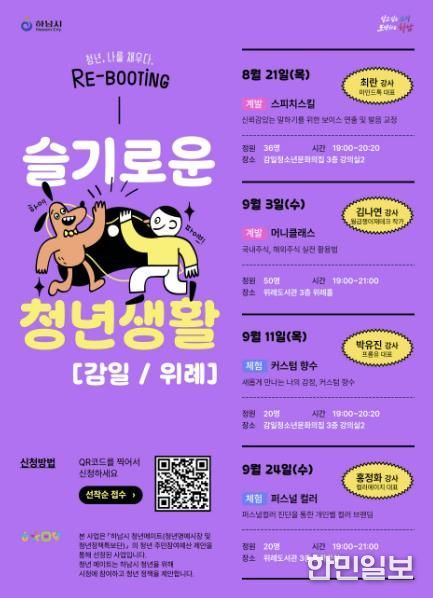 오는 9월 3일부터는 △‘머니클래스’ △‘커스텀 향수’ △‘퍼스널 컬러’ 프로그램이 감일청소년문화의집과 위례도서관에서 격주로 운영된다. 참여 희망자는 월별 일정에 맞춰 네이버폼을 통해 신청할 수 있으며, 자세한 사항은 하남시청 홈페이지에서 확인 가능하다.