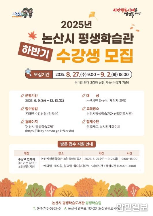 한민일보 서울포커스 유돈상 기자 | 논산시는 오는 8월 27일부터 9월 2일까지 ‘2025년 논산시 평생학습관 하반기 정규 프로그램’ 수강생을 선착순으로 모집한다.