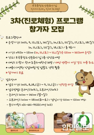 한민일보 서울포커스 전희주 기자 | 의왕시청소년재단 부곡동청소년문화의집은 2025년 지역연계 위탁 프로그램 ‘인사이드미, 인싸 is ME!’ 3차(진로체험) 프로그램에 참여할 청소년을 모집한다.