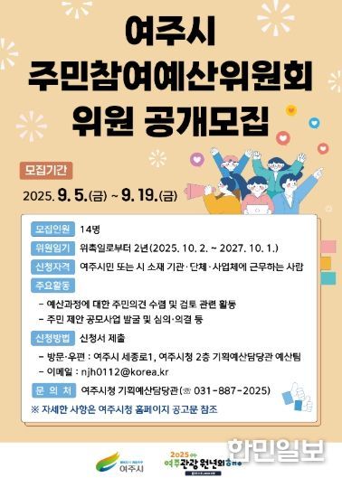 한민일보 서울포커스 전희주 기자 | 여주시는 지난 9월 5일부터 오는 9월 19일까지 2주간 주민참여예산제 운영을 위한 위원 14명을 공개 모집한다.