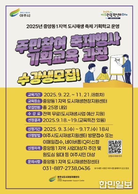 한민일보 서울포커스 전희주 기자 | 여주시는 중앙동1지역 도시재생 뉴딜사업으로 일환으로 추진되는 '2025년 중앙동1지역 축제 행사 기획학교'를 이달 22일부터 운영한다고 밝혔다.
