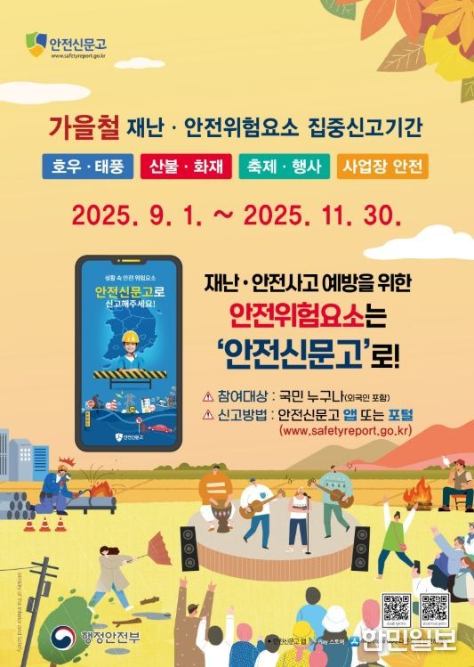 신고 대상은 호우·태풍, 산불·화재, 축제·행사, 사업장 안전 등으로 △빗물받이 막힘, 붕괴・강풍 위험, 하천 제방 유실 △불법 취사·소각, 담배꽁초 투기, 소화시설 미정비 △인파 밀집 우려, 안전관리 미흡, 전기시설 방치 △안전수칙 미준수, 건설현장 위험 등이 포함된다.