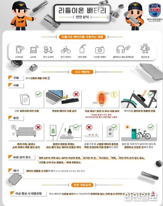 엄준욱 대구소방안전본부장은 “리튬이온 배터리는 생활 속 필수품이지만 관리 소홀 시 대형 화재로 이어질 수 있다”며, “시민 여러분께서는 작은 안전수칙을 실천해 나와 가족, 이웃의 안전을 지켜주길 바란다”고 말했다.