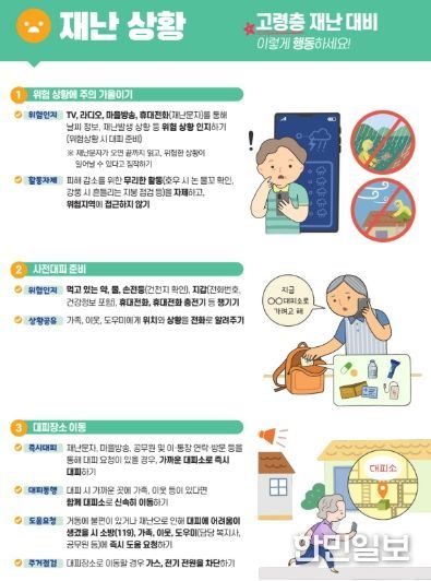 한민일보 서울포커스 최성훈 기자 | 서산소방서는 태풍‧집중호우 등 자연재난 발생 시 피해에 취약한 고령층 안전을 위해 재난 상황과 재난 후에 행동요령을 담은 자료를 첨부해 홍보에 나섰다.