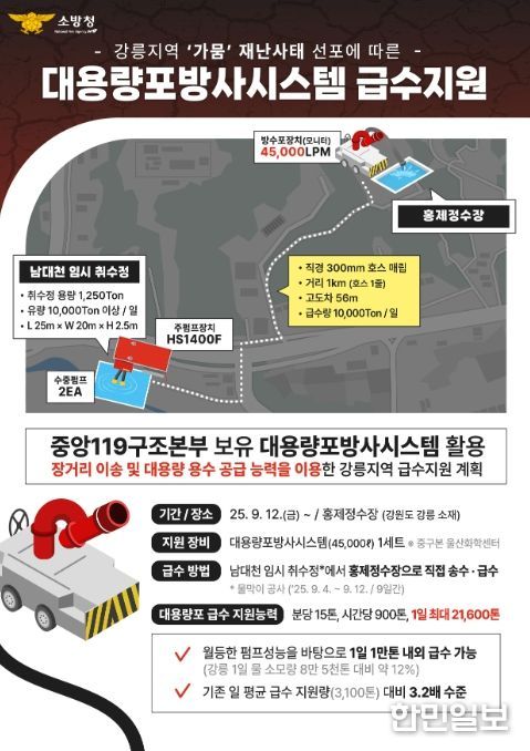 이번 급수 지원은 중앙119구조본부가 보유한 분당 45,000리터급 대용량포방사시스템을 활용해 하루 최대 1만 톤 이상 공급하는 것을 목표로 한다.