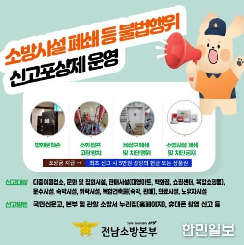한민일보 서울포커스 박용남 기자 | 해남소방서는 화재 발생 시 신속한 대피를 위한 피난통로 확보와 화재 안전관리 강화를 위해, 비상구 폐쇄나 소방시설 차단과 같은 불법행위에 대한 신고포상제를 연중 시행 중이라고 밝혔다.