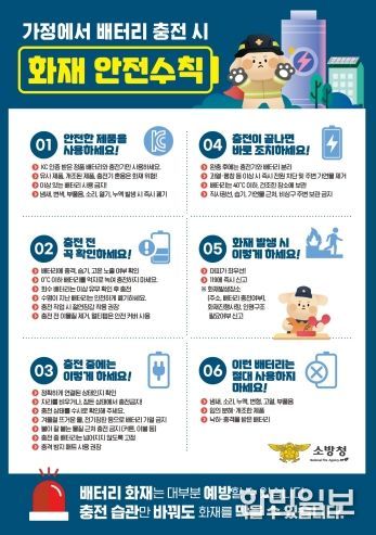 이에 광명소방서는 시민들이 지켜야 할 안전수칙으로 ▲충전 완료 후 전원 차단 ▲손상된 배터리 사용 금지 ▲외출 시 충전 금지 ▲습도 높은 장소 보관 금지 ▲과충전·과열 주의 등을 당부했다. 또한 사용 중 연기나 불꽃, 타는 냄새가 발생할 경우 즉시 사용을 중단하고 119에 신고해야 한다고 강조했다.