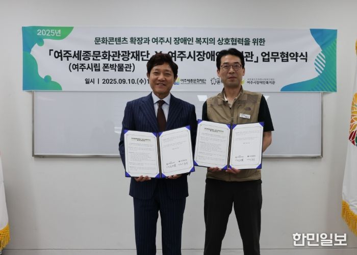한민일보 서울포커스 전희주 기자 | 여주세종문화관광재단 여주시립폰박물관과 대한불교조계종사회복지재단 여주시장애인복지관은 지난 9월 10일 장애인 문화 향유 기회 확대와 복지 증진을 위한 업무협약(MOU)을 체결했다.