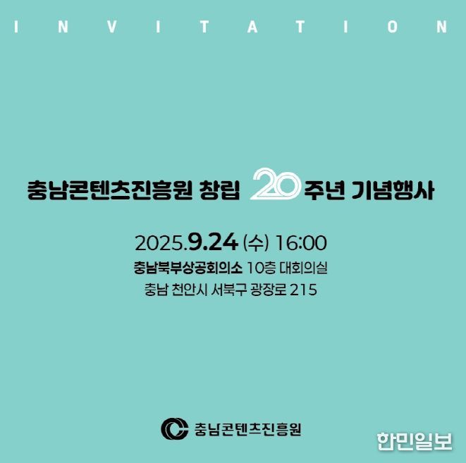 한민일보 서울포커스 박덕환 기자 | 충남콘텐츠진흥원은 오는 9월 24일 오후 4시 충남북부상공회의소 10층 대회의실에서 창립 20주년 기념행사를 개최한다고 밝혔다.