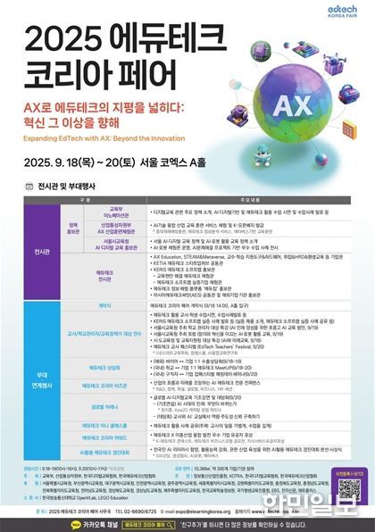 2006년부터 시작된 ‘에듀테크 코리아 박람회(페어)’는 올해 “에이엑스(AX)로 에듀테크의 지평을 넓히다: 혁신 그 이상을 향해(Expanding EdTech with AX: Beyond the Innovation)”를 주제로 열린다. 이번 행사에는 전 세계 16개국 약 300여개 기업이 참여하며, △에듀테크 기업 전시관, △교육부, 산업부, 시·도교육청 정책 홍보관, △에듀테크 소프트랩 홍보관, △학교-기업 1:1 상담 부스 등 다양한 전시관 및 부대행사 등이 다채롭게 운영될 예정이다.