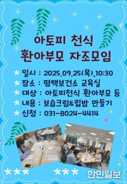 한민일보 서울포커스 황준형 기자 | 평택시는 지역 사회 중심의 알레르기 질환(아토피·천식 등) 예방관리 환경 조성을 위해 ‘아토피·천식 환아 부모 자조모임’을 운영하고 있으며, 오는 25일 열리는 3분기 모임에 함께할 신규 참여자를 모집한다.