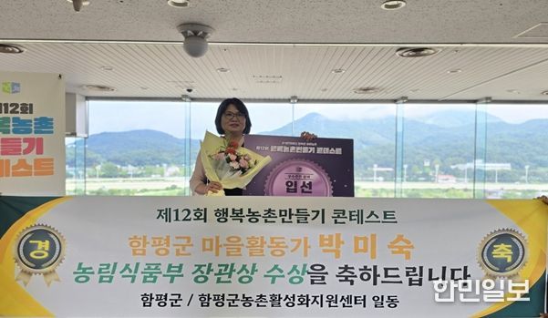 한민일보 서울포커스 박용남 기자 | 전남 함평군 마을활동가 박미숙 씨가 제12회 행복농촌만들기 콘테스트에서 우수주민(활동가) 부문 농림축산식품부 장관상을 수상하며 군민 자긍심을 높이고 있다.