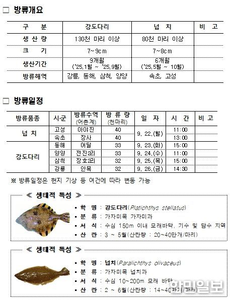 방류 지역은 강릉시, 동해시, 속초시, 삼척시, 고성군, 양양군 등 동해안 주요 마을어장 인근 해역이다.