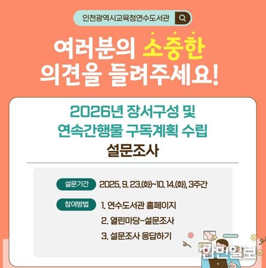 한민일보 서울포커스 유창렬 기자 | 인천광역시교육청연수도서관은 9월 23일부터 3주간 ‘2026년 장서 구성 및 연속간행물 구독 계획 수립’을 위한 설문조사를 진행한다.