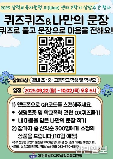 한민일보 서울포커스 곽중희 기자 | 삼척교육지원청 위(Wee)센터에서는 9월 22일에서 10월 2일까지 진행되는 ‘2학기 상담주간’을 맞아, 학생 참여형 심리 프로그램인 ‘퀴즈퀴즈&나만의 문장’을 새롭게 운영한다고 밝혔다.