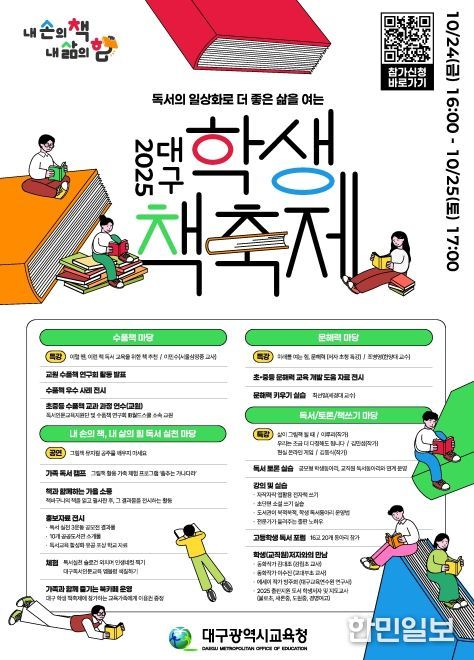 한민일보 서울포커스 임철현 기자 | 대구시교육청은 독서인문교육 소통의 장을 마련하기 위해 10월 24일부터 25일까지 대구민주시민교육센터와 대구2․28기념학생도서관에서 ‘2025. 대구 학생 책축제’를 개최한다.
