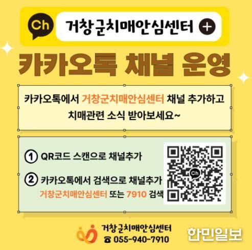 채널 이용방법은 카카오톡 앱에서 ‘거창군치매안심센터’ 또는 대표번호 ‘7910’을 검색하거나 포스터의 QR코드를 스캔해서 추가하면 된다.