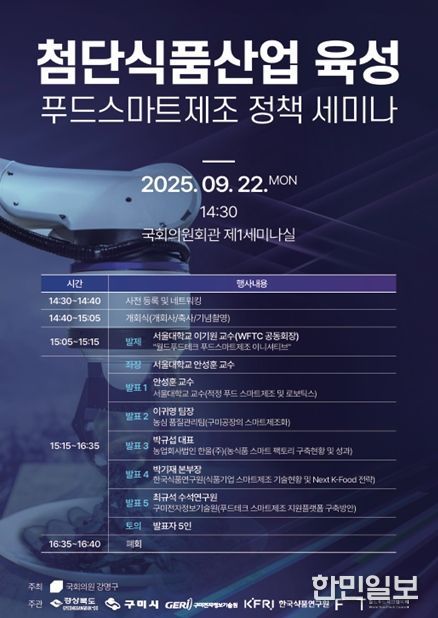 한민일보 서울포커스 임철현 기자 | 경북도는 22일 국회의원회관 제1세미나실에서 강명구 국회의원과 공동으로 ‘첨단식품산업 육성 푸드 스마트제조 정책 세미나’를 개최했다.