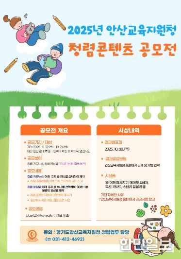 한민일보 서울포커스 임철현 기자 | 경기도안산교육지원청은 9월 22일부터 10월 21일까지 한 달간 ‘2025년 청렴 콘텐츠 공모전’을 개최한다고 밝혔다.