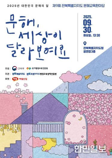 한민일보 서울포커스 박용남 기자 | 전북특별자치도평생교육장학진흥원은 오는 9월 30일 전북특별자치도청 공연장에서 '제9회 전북특별자치도 문해교육 한마당'을 개최한다.