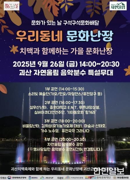 한편, ‘우리동네 문화난장’은 괴산군민을 위한 생활 밀착형 문화 배달 프로그램으로, 매월 마지막 주 수요일 ‘문화가 있는 날’ 주간에 진행되며, 오는 10월까지 이어질 예정이다.