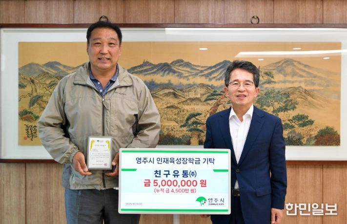 한민일보 서울포커스 김봉순 기자 | 재)영주시인재육성장학회는 지난 23일, 친구유통㈜(대표 하원태)로부터 지역 인재 양성을 위한 장학금 500만 원을 기탁받았다고 밝혔다.