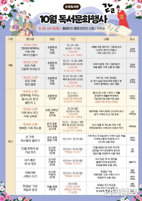 또, 10월 문화의 달을 기념하여 ▲문해력 필사노트 완성 챌린지, ▲문화의 달 기념 퀴즈, ▲내가 뽑은 책 속 한 구절, ▲세종대왕 사행시 쓰기 등 다양한 추첨 경품 행사도 함께 진행된다.